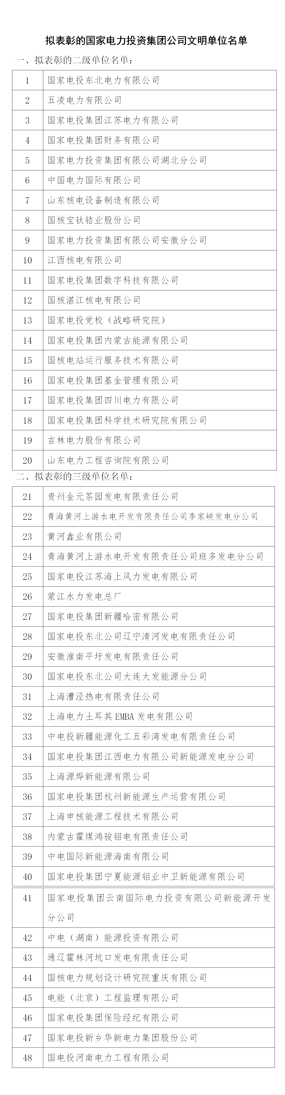 根據(jù)《國家電力投資集團(tuán)有限公司文明單位建設(shè)管理辦法》相關(guān)要求,現(xiàn)將擬表彰的國家電力投資集團(tuán)公司文明單位名單予以公示。公示期間,如對擬表彰單位有異議,可通過電子郵箱、電話等方式向集團(tuán)公司宣傳與群團(tuán)部實(shí)名反映(注明真實(shí)姓名、聯(lián)系方式)。反映的情況要客觀真實(shí)、實(shí)事求是,對線索不清的匿名反映不予受理。