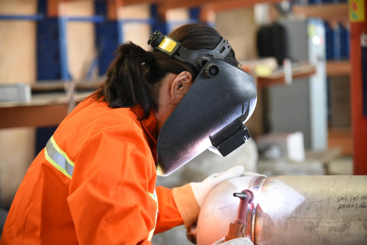 技藝精進(jìn)的同時(shí),徐穎慧不忘大膽創(chuàng)新。在管道氬弧焊(鎢極惰性氣體保護(hù)電弧焊)過(guò)程中,為了保護(hù)不銹鋼管道焊縫不被氧化,焊工們需要在焊接前向管內(nèi)充入惰性氣體——?dú)鍤�,并封堵管道兩端后再進(jìn)行焊接。封堵管道口所用的工具是車間清潔用的棉布。焊接過(guò)程中,徐穎慧發(fā)現(xiàn)隨著焊接位置的變化,焊接試件在轉(zhuǎn)動(dòng)時(shí)棉布極易脫落和燃燒。沒(méi)有了氬氣保護(hù),焊縫就不合格,產(chǎn)品又要重新返工�!跋喈�(dāng)于白干,不僅我自己遇到這樣的情況,我的同事也遭受過(guò)同樣的問(wèn)題,為什么不做幾套工具把棉布替換掉呢?”她在心里盤算著。徐穎慧參照不同規(guī)格管道的尺寸,用不銹鋼制作了一整套充氬工裝。“我就是把想法落地,讓后續(xù)的焊接更高效更方便�!闭沁@個(gè)不起眼的“小改良”,在后續(xù)生產(chǎn)中為企業(yè)節(jié)約了三分之一的氬氣,使生產(chǎn)流程變得更為安全可控,進(jìn)一步保證了產(chǎn)品的焊接質(zhì)量。