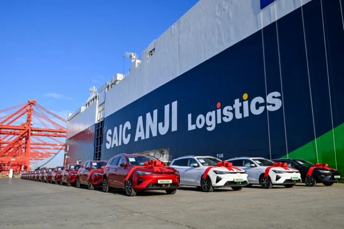 上汽集團旗下9500車位遠洋汽車運輸船“安吉安盛”輪搭載著上汽自主品牌車型駛往歐洲