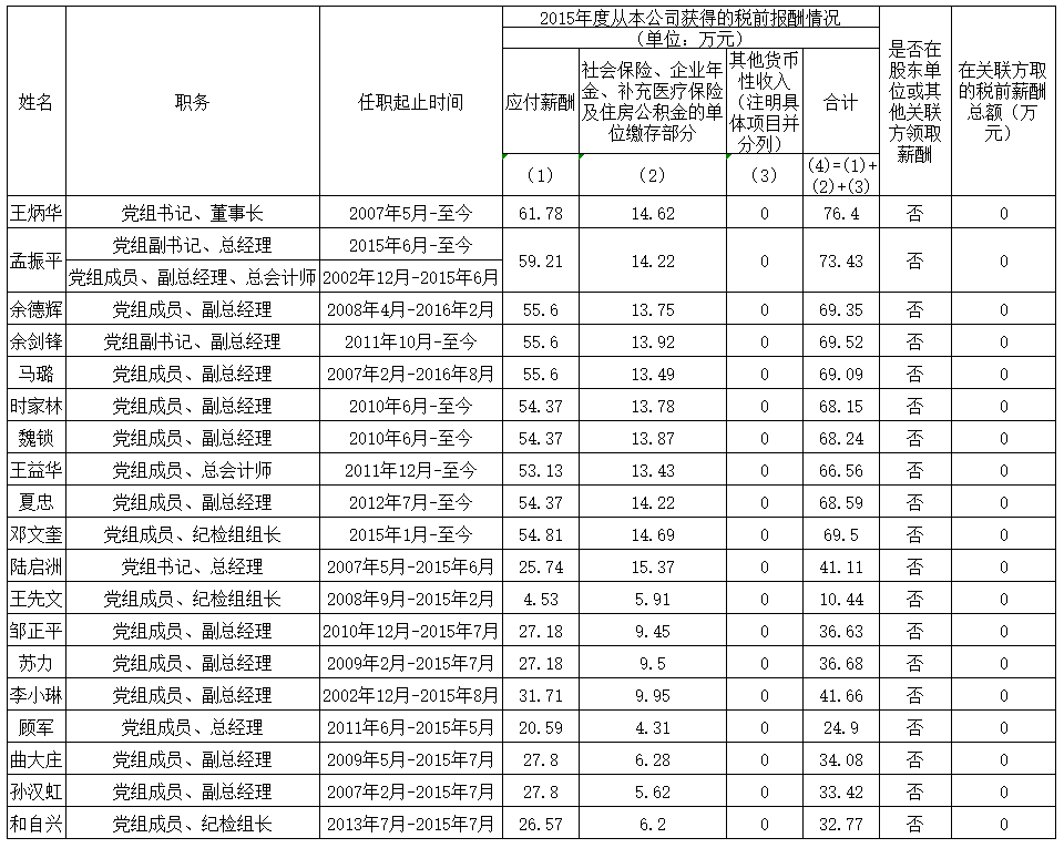 備注:上表披露信息為我公司企業(yè)負責(zé)人2015年度全部應(yīng)發(fā)稅前薪酬,按國家規(guī)定由單位繳存各種社會保險等。其中,第(1)項由國務(wù)院國資委核定。