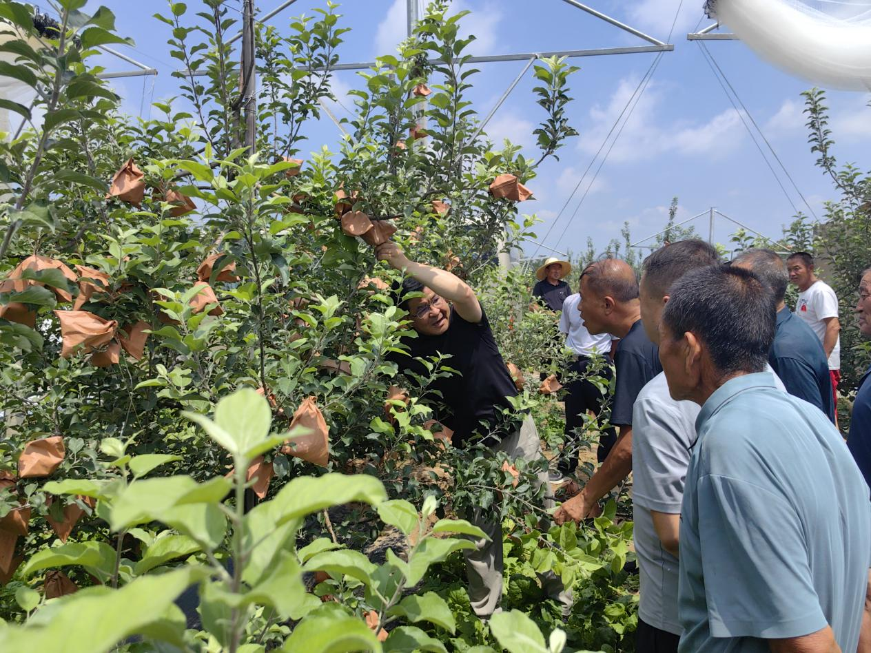 黨校組織中國(guó)農(nóng)科院果樹所與當(dāng)?shù)貙<以谔O果種植基地開展現(xiàn)場(chǎng)教學(xué),講解果樹種植技術(shù)和修剪手法。