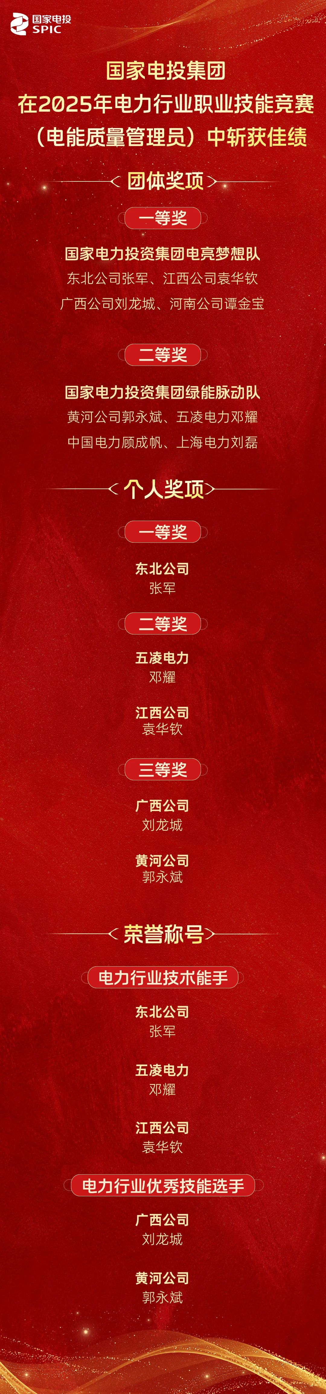 近日,2025年電力行業(yè)職業(yè)技能競(jìng)賽(電能質(zhì)量管理員)在山東臨沂收官。國家電投集團(tuán)2支代表隊(duì)、8名選手在此次競(jìng)賽中表現(xiàn)卓越,喜獲佳績。國家電投集團(tuán)電亮夢(mèng)想隊(duì)獲團(tuán)體一等獎(jiǎng)(發(fā)電組中唯一獲此殊榮),國家電投集團(tuán)綠能脈動(dòng)隊(duì)獲團(tuán)體二等獎(jiǎng),國家電投集團(tuán)東北公司張軍獲個(gè)人一等獎(jiǎng)(發(fā)電組中唯一獲此殊榮)并被中電聯(lián)授予“電力行業(yè)技術(shù)能手”榮譽(yù)稱號(hào),五凌電力鄧耀、江西公司袁華欽獲個(gè)人二等獎(jiǎng)并被中電聯(lián)授予“電力行業(yè)技術(shù)能手”稱號(hào),廣西公司劉龍城、黃河公司郭永斌獲個(gè)人三等獎(jiǎng)并被中電聯(lián)授予“電力行業(yè)優(yōu)秀技能選手”稱號(hào)。