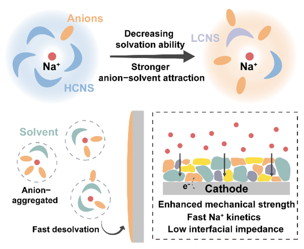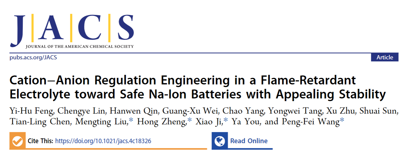 該研究成果以《阻燃電解液中陽離子-陰離子調(diào)控策略構(gòu)建高安全長循環(huán)鈉離子電池》(Cation–Anion Regulation Engineering in a Flame-Retardant Electrolyte toward Safe Na-Ion Batteries with Appealing Stability)為題,發(fā)表在國際頂尖學術(shù)期刊《美國化學會志》(Journal of the American Chemical Society)上。西安交通大學博士生馮意虎為本文第一作者,西安交通大學王鵬飛教授、鄭紅教授、劉夢婷助理教授,華中科技大學吉曉研究員為本文共同通訊作者。論文第一單位為西安交通大學電工材料電氣絕緣全國重點實驗室。