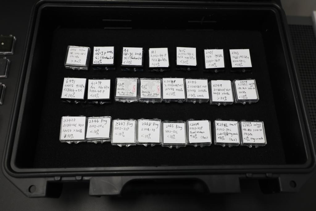北京高壓科學(xué)研究中心的實(shí)驗(yàn)室里,已完成實(shí)驗(yàn)的破碎金剛石樣品被編上號(hào)、貼上標(biāo)簽,保存起來。圖為打開盒蓋后已完成實(shí)驗(yàn)的部分破碎金剛石樣品。(受訪者供圖)