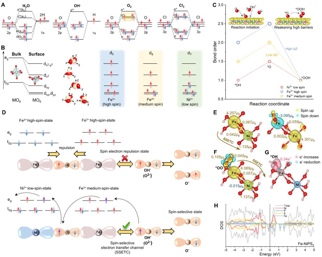 近日,西安交通大學(xué)科研人員提出了通過(guò)非對(duì)稱Fe-Ni立構(gòu)策略以實(shí)現(xiàn)原子級(jí)局域自旋調(diào)控的新機(jī)制。將Fe引入NiPS3晶格后引起自旋態(tài)重新分布,形成具有中自旋態(tài)(MS)的Fe3+活性位點(diǎn)。通過(guò)P/S配位進(jìn)一步穩(wěn)定Fe3+的MS態(tài),并憑借自犧牲抑制競(jìng)爭(zhēng)性的Cl氧化反應(yīng)及Cl毒化。該催化劑在堿性及真實(shí)海水電解中均展現(xiàn)出優(yōu)異性能,在10mAcm2條件下的工作電壓僅為1.50V/1.52V,并能保持1000小時(shí)穩(wěn)定運(yùn)行。此外,該催化劑在陰離子交換膜(海)水電解槽(AEM(S)WE)器件中也表現(xiàn)出穩(wěn)定低壓的工作優(yōu)勢(shì)。此外,通過(guò)理論計(jì)算、X射線吸收譜、電子順磁共振、穆斯堡爾譜等多維度技術(shù)手段,系統(tǒng)地揭示了MSFe3+在促進(jìn)自旋選擇性電子轉(zhuǎn)移中的關(guān)鍵作用。本研究為非貴金屬催化體系中構(gòu)建內(nèi)在自旋調(diào)控路徑提供了新范式,對(duì)綠色高效制氫催化劑設(shè)計(jì)具有重要參考意義。