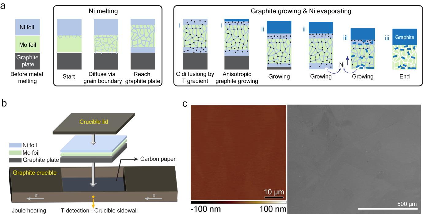 (a)建議的反應(yīng)路徑示意圖。(b)實(shí)驗(yàn)配置示意圖。(c)鏡面石墨膜的 AFM 高度圖像和 SEM 圖像。圖片來(lái)源:韓國(guó)基礎(chǔ)科學(xué)研究所