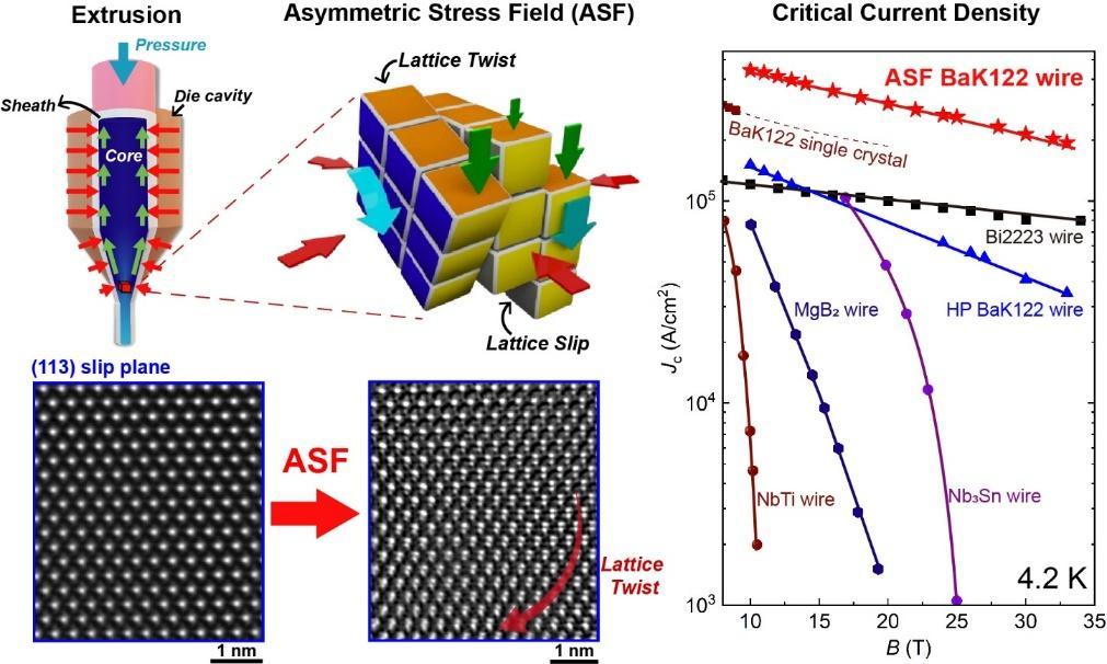 針對該難題,研究團隊創(chuàng)新提出“非對稱應(yīng)力場”調(diào)控策略,采用規(guī)�;瘮D壓成形技術(shù),協(xié)同調(diào)控靜水壓力與剪切應(yīng)力,成功在脆性超導(dǎo)晶格中誘導(dǎo)出高密度、有序排列的位錯結(jié)構(gòu),形成高效磁通釘扎中心,顯著提升了材料在強磁場下的電流承載能力。