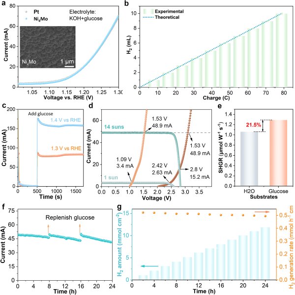 當(dāng)該陽極體系與地殼豐度較高的Ni4Mo陰極耦合時,在無隔膜電池中可實現(xiàn)近100%法拉第效率的純氫生成。在聚光太陽照射下,裝置的制氫速率達到519.5±0.4μmol·h-1·cm-2,并在連續(xù)24小時運行中保持穩(wěn)定性能。