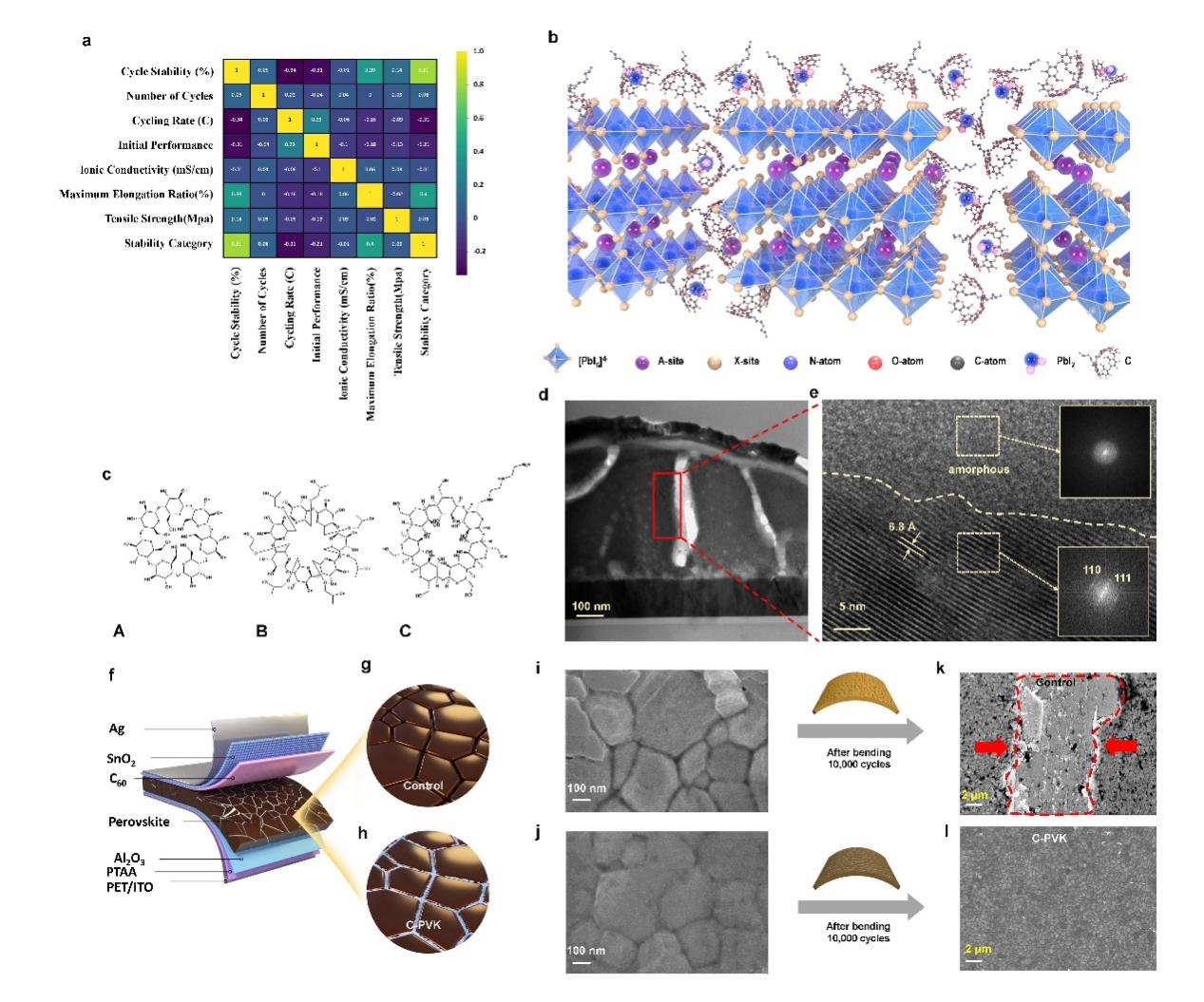 傳統(tǒng)鈣鈦礦太陽(yáng)能電池在性能提升中常依賴(lài)PbI2或低維鈣鈦礦鈍化。然而,PbI2能級(jí)單一且高度結(jié)晶易破壞界面,低維鈣鈦礦則可能因有機(jī)組分?jǐn)U散而導(dǎo)致長(zhǎng)期工作失效,且在彎折應(yīng)力會(huì)導(dǎo)致PbI2/低維鈣鈦礦這些晶態(tài)材料的性能發(fā)生變化。研究團(tuán)隊(duì)創(chuàng)新性地采用主-客體材料與Pb-I構(gòu)建非晶復(fù)合鈍化層,通過(guò)分子設(shè)計(jì)實(shí)現(xiàn)能級(jí)調(diào)控,并保持材料在彎折和長(zhǎng)期使用中的穩(wěn)定性。