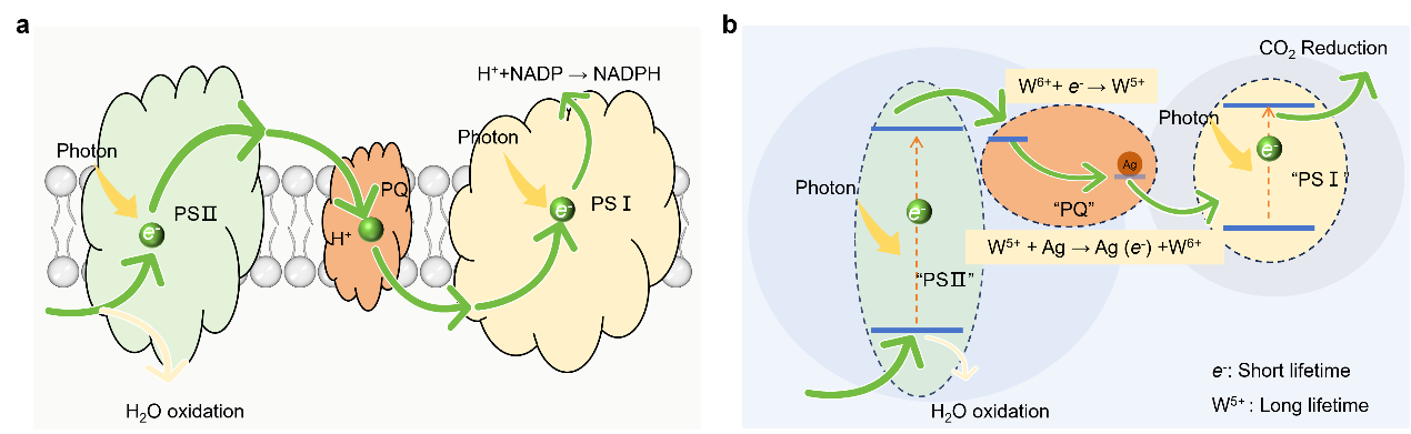 植物通過光合作用,巧妙地將結(jié)構(gòu)簡單的二氧化碳和水轉(zhuǎn)化為復(fù)雜的養(yǎng)分分子,為人類借助化學(xué)手段實(shí)現(xiàn)溫室氣體二氧化碳的資源化利用提供了自然范例。然而,人工模擬光合作用的過程仍面臨科學(xué)挑戰(zhàn),其關(guān)鍵瓶頸在于:光激發(fā)功能材料所產(chǎn)生的電子(用于還原二氧化碳)與空穴(用于氧化水)壽命極短,難以實(shí)現(xiàn)二者反應(yīng)的同步與持續(xù)進(jìn)行。