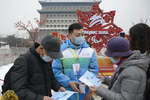 ▲王興(左二)在北京前門步行街為游人講解冬奧場館