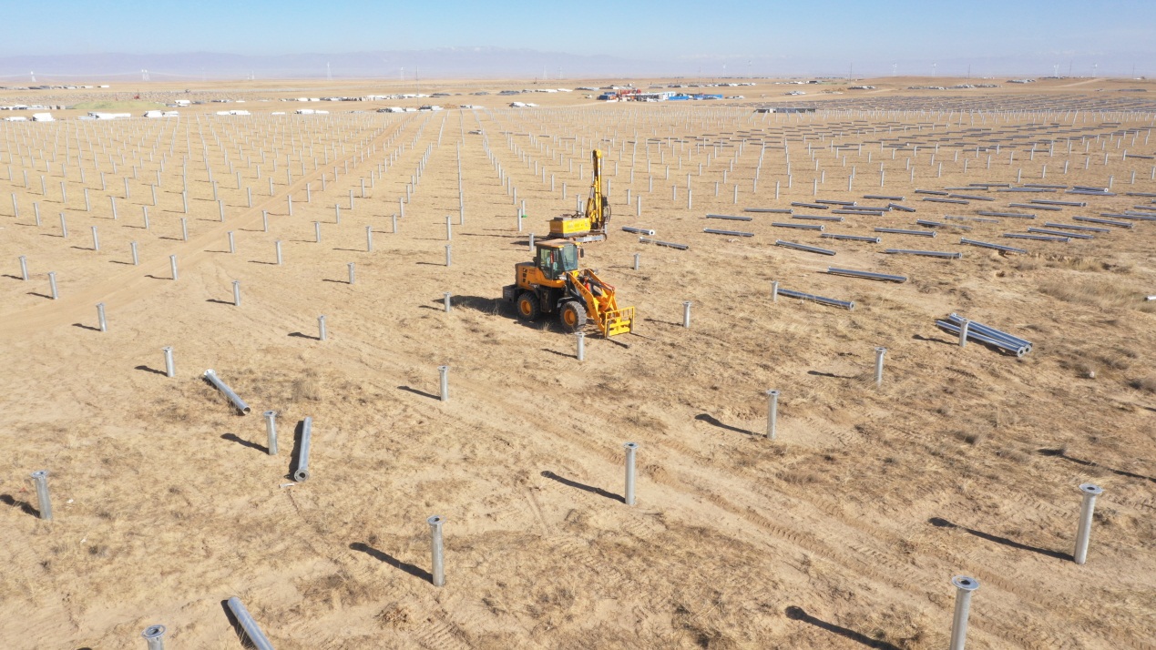 海南州特高壓外送通道配套電源點220萬光伏項目的建設(shè)現(xiàn)場之一,圖為正在安裝的陣列區(qū)鋼管樁
